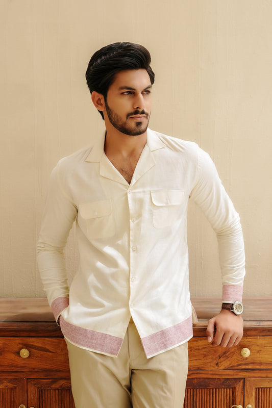 Chamois Pin Stripe Linen Shirt with White Button Down Collar.