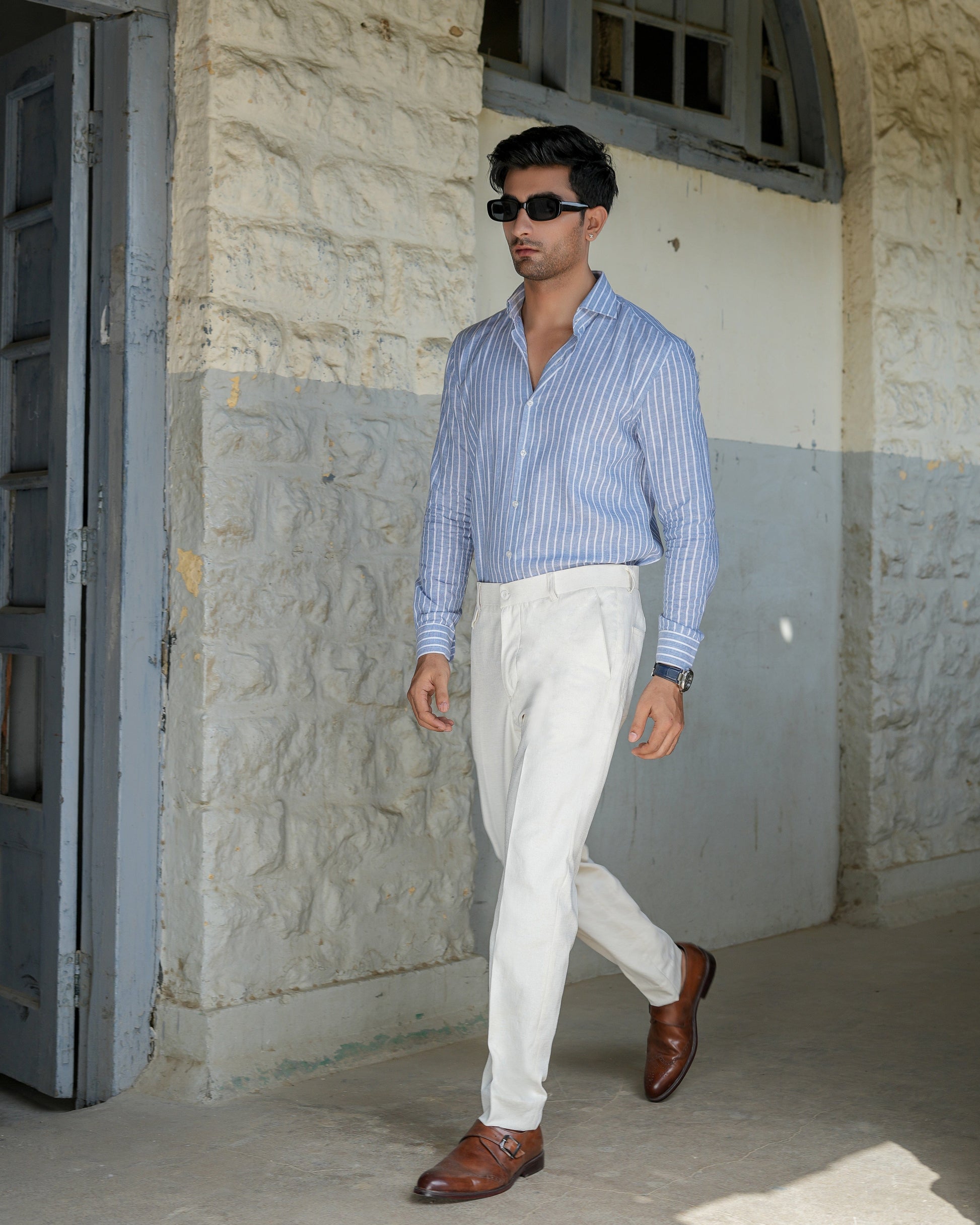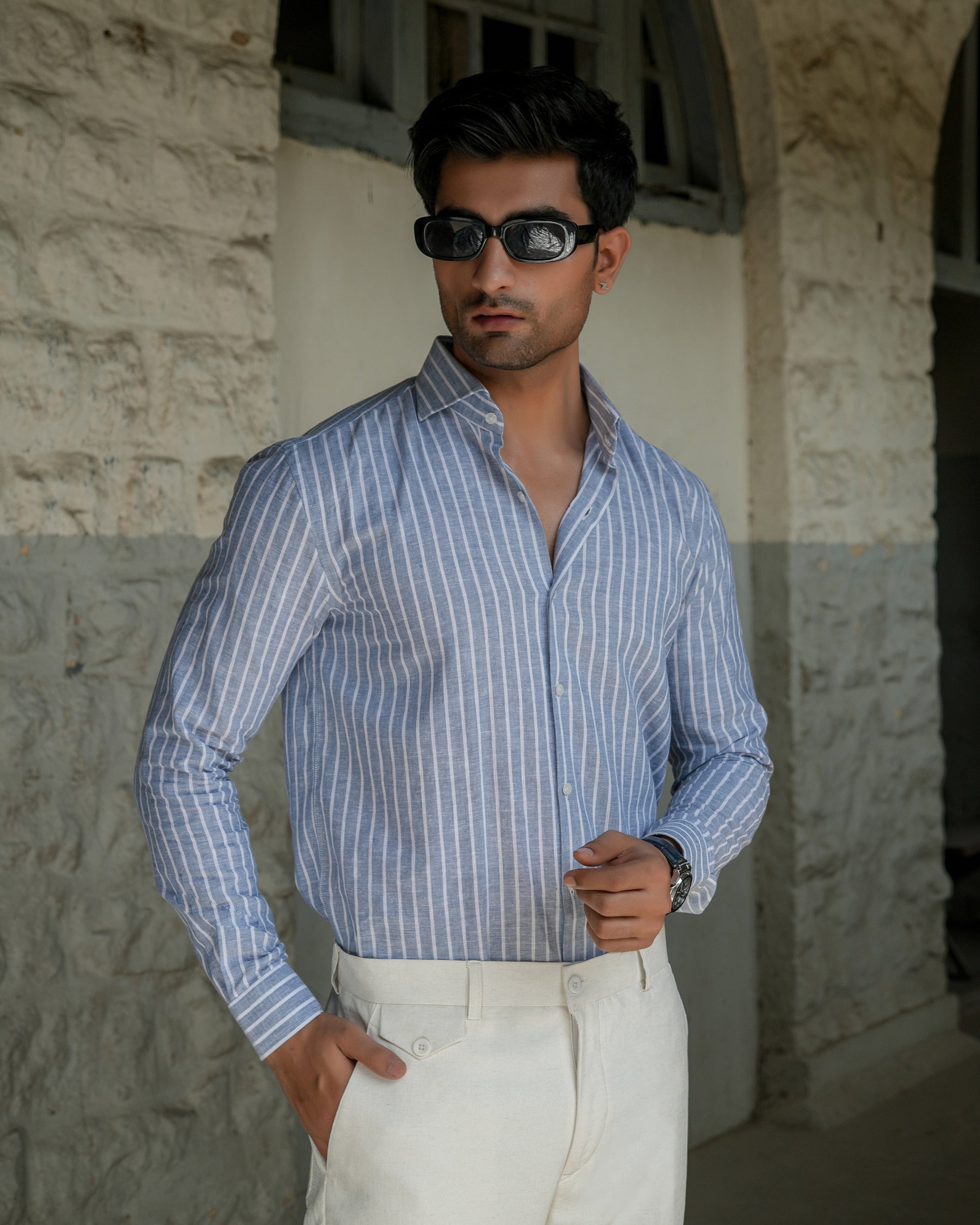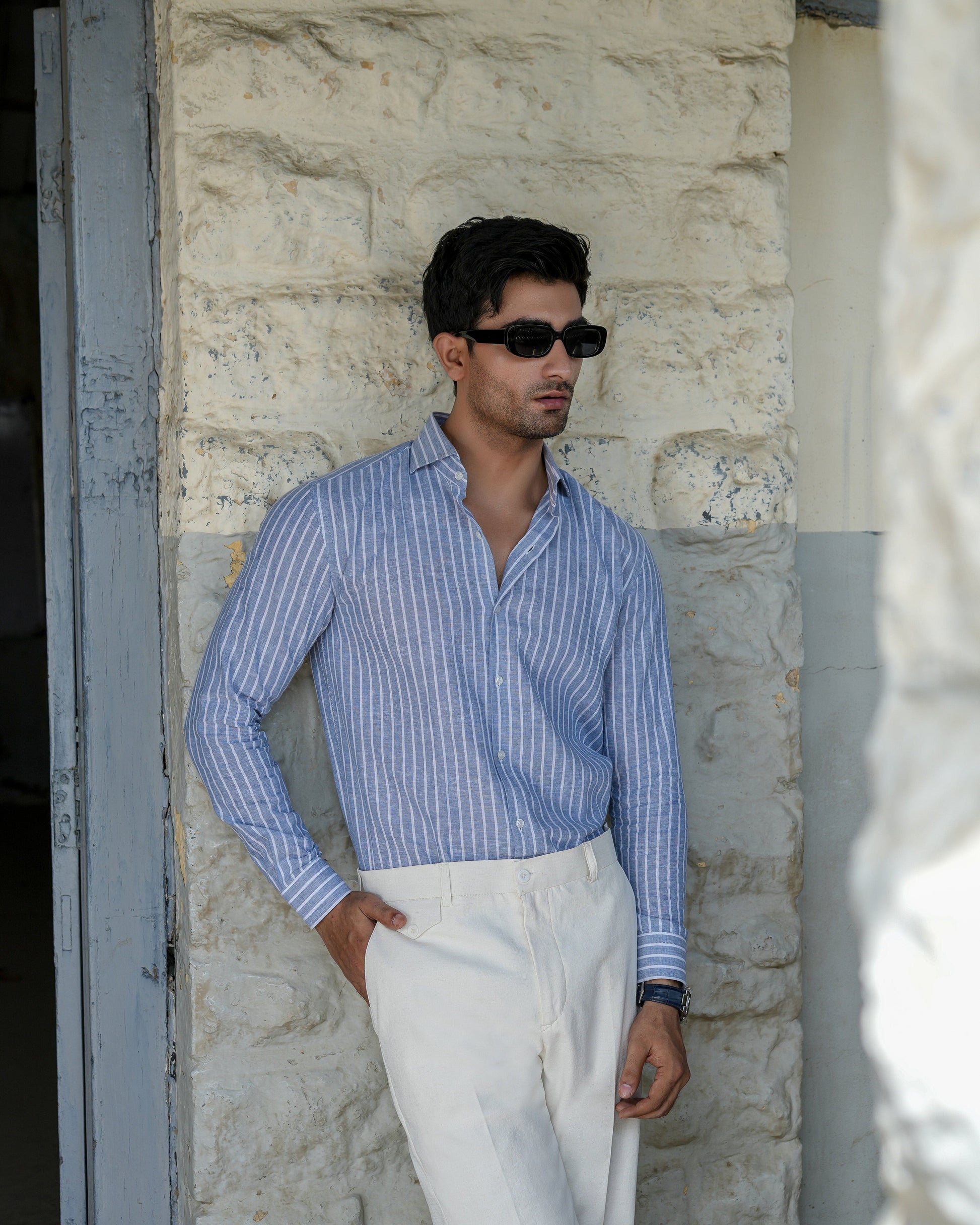 Stay cool and stylish in this blue striped linen shirt by Chamois. Made from breathable, lightweight linen, it's perfect for warm days and laid-back looks. Features a classic fit, button front, and timeless vertical stripes for effortless versatility.