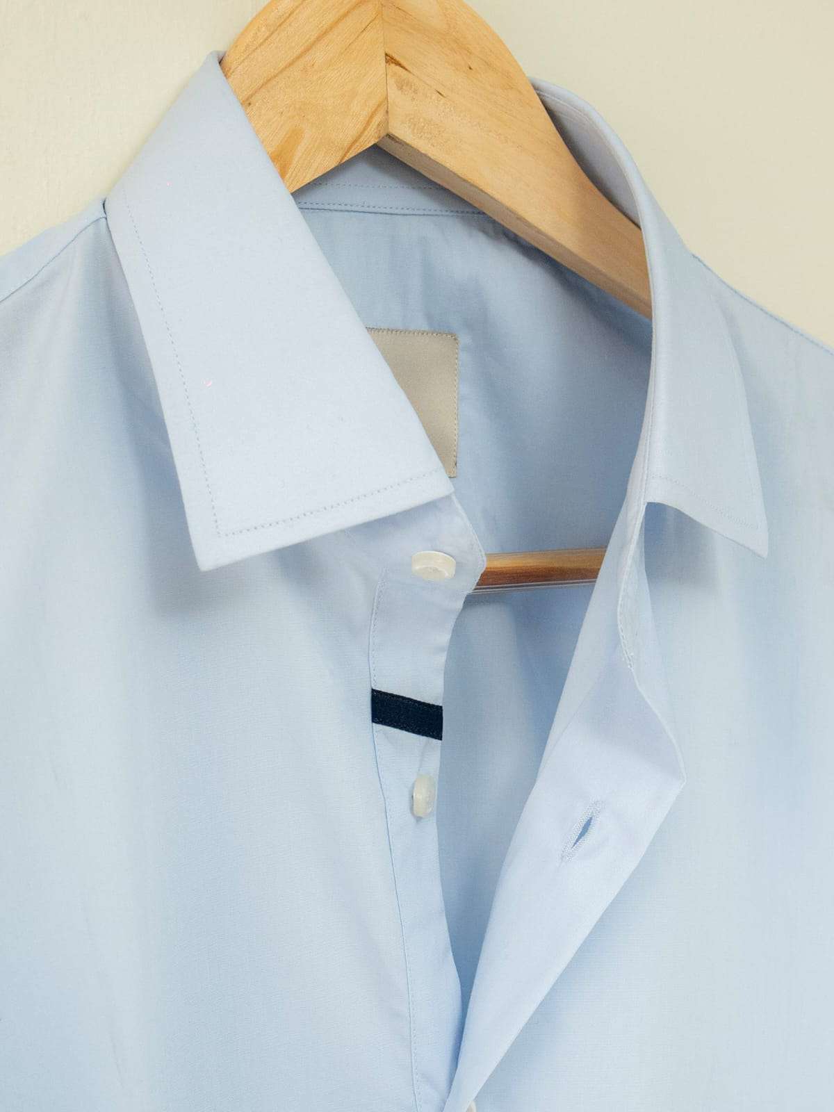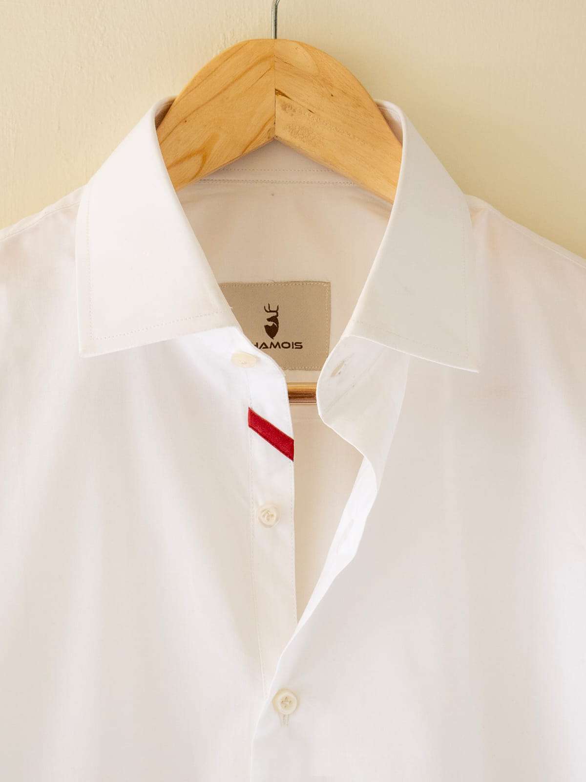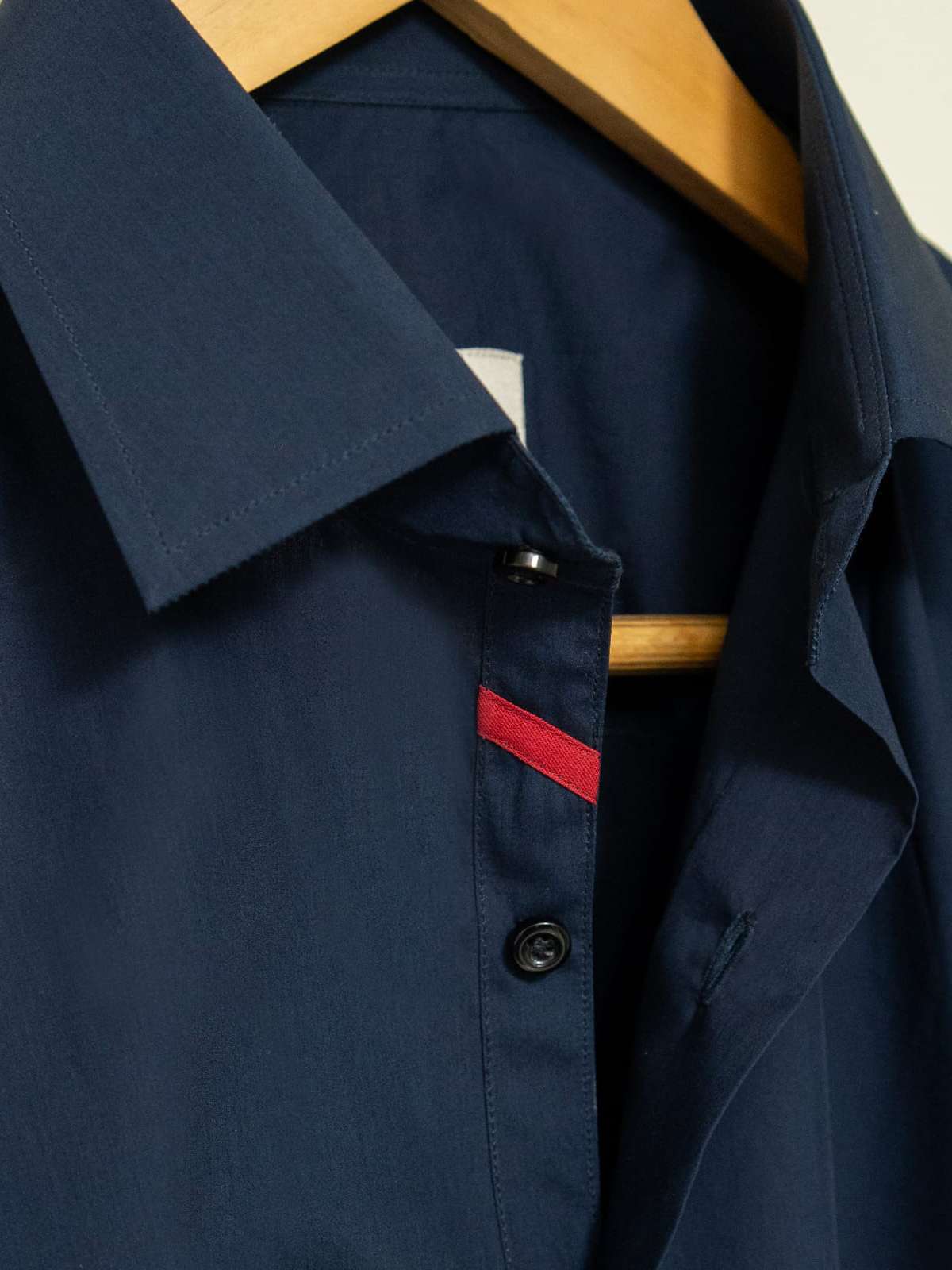 Cross rib shirt has inside detail of cross tape between two buttons. It will popup your style when you remove the tie.