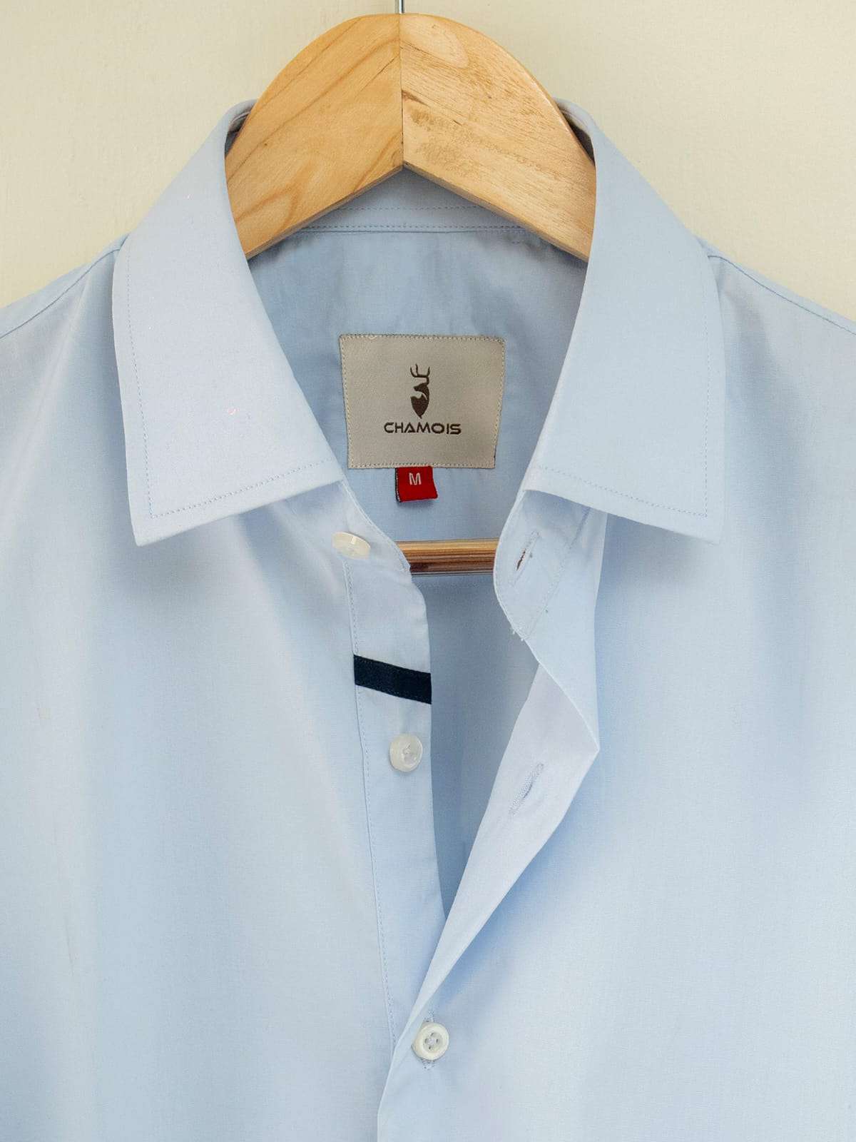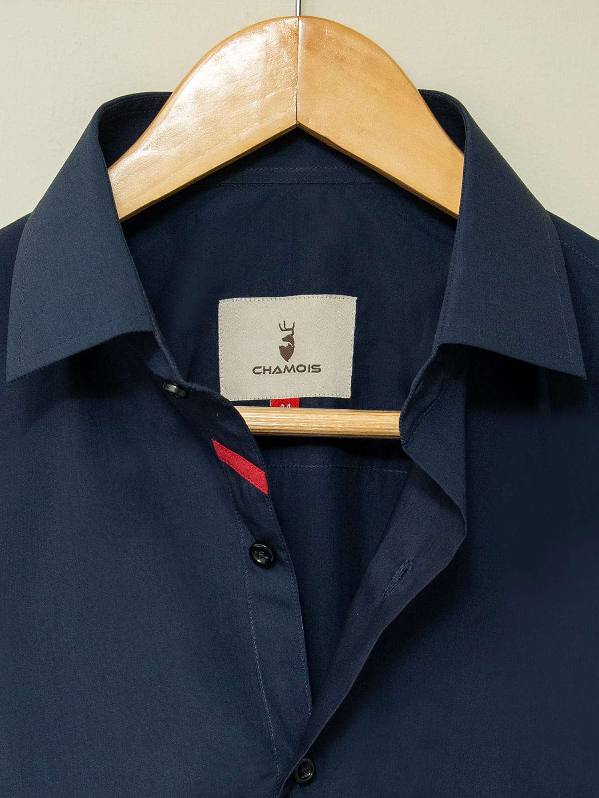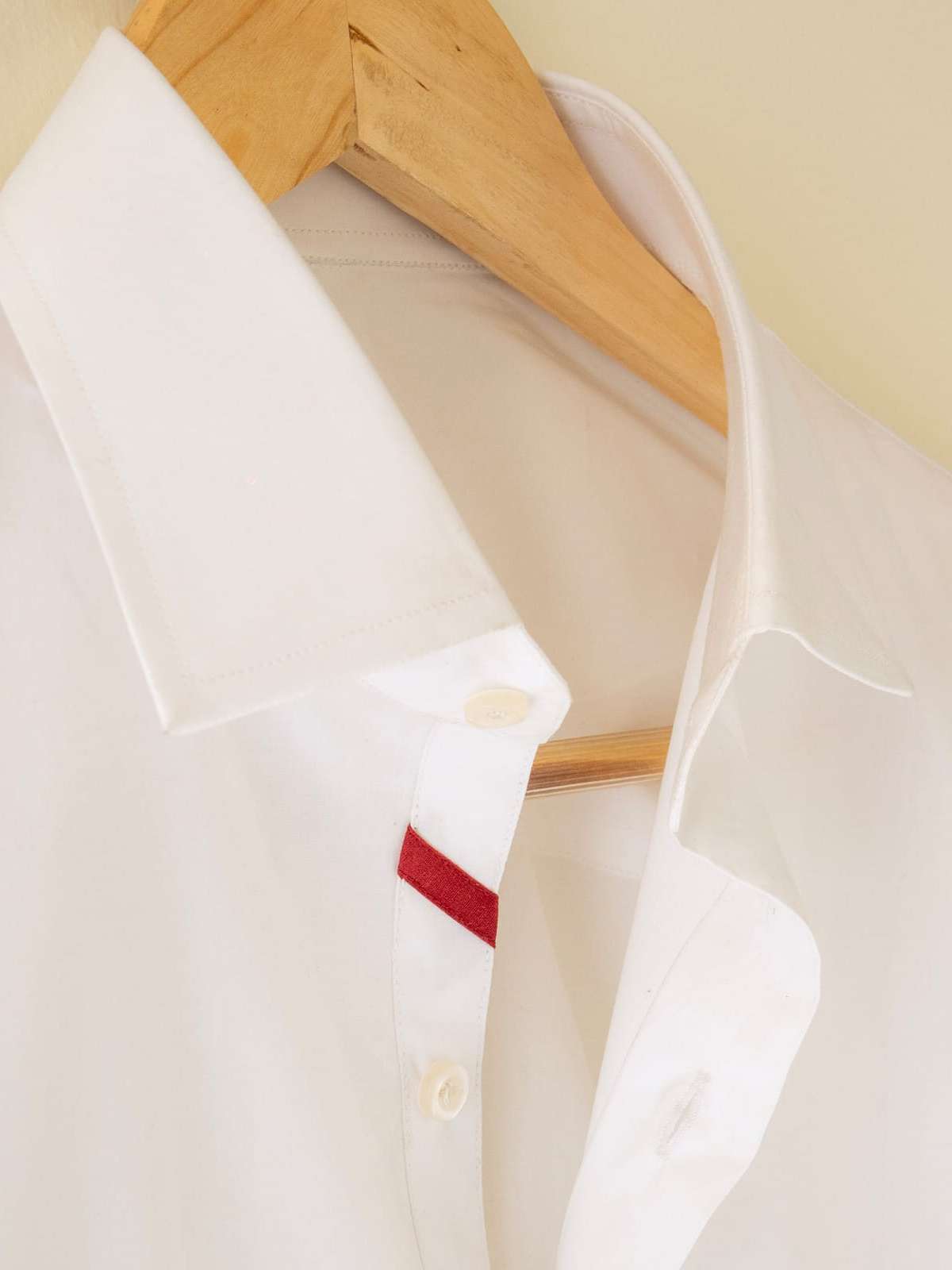 Cross rib shirt has inside detail of cross tape between two buttons. It will popup your style when you remove the tie.
