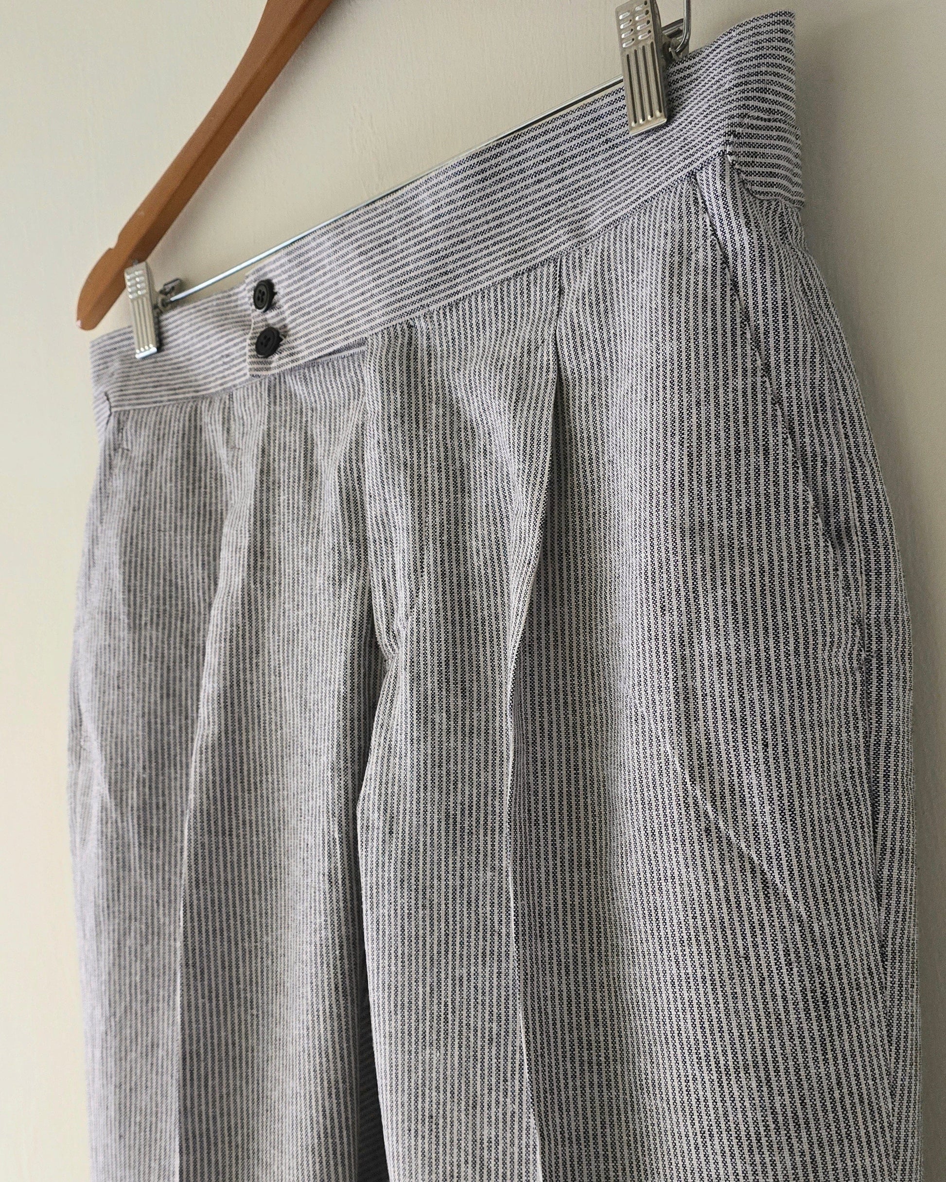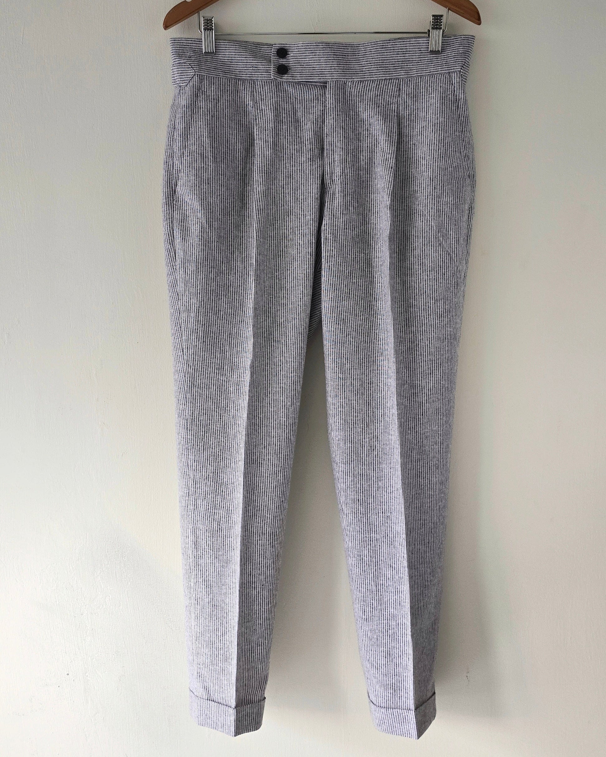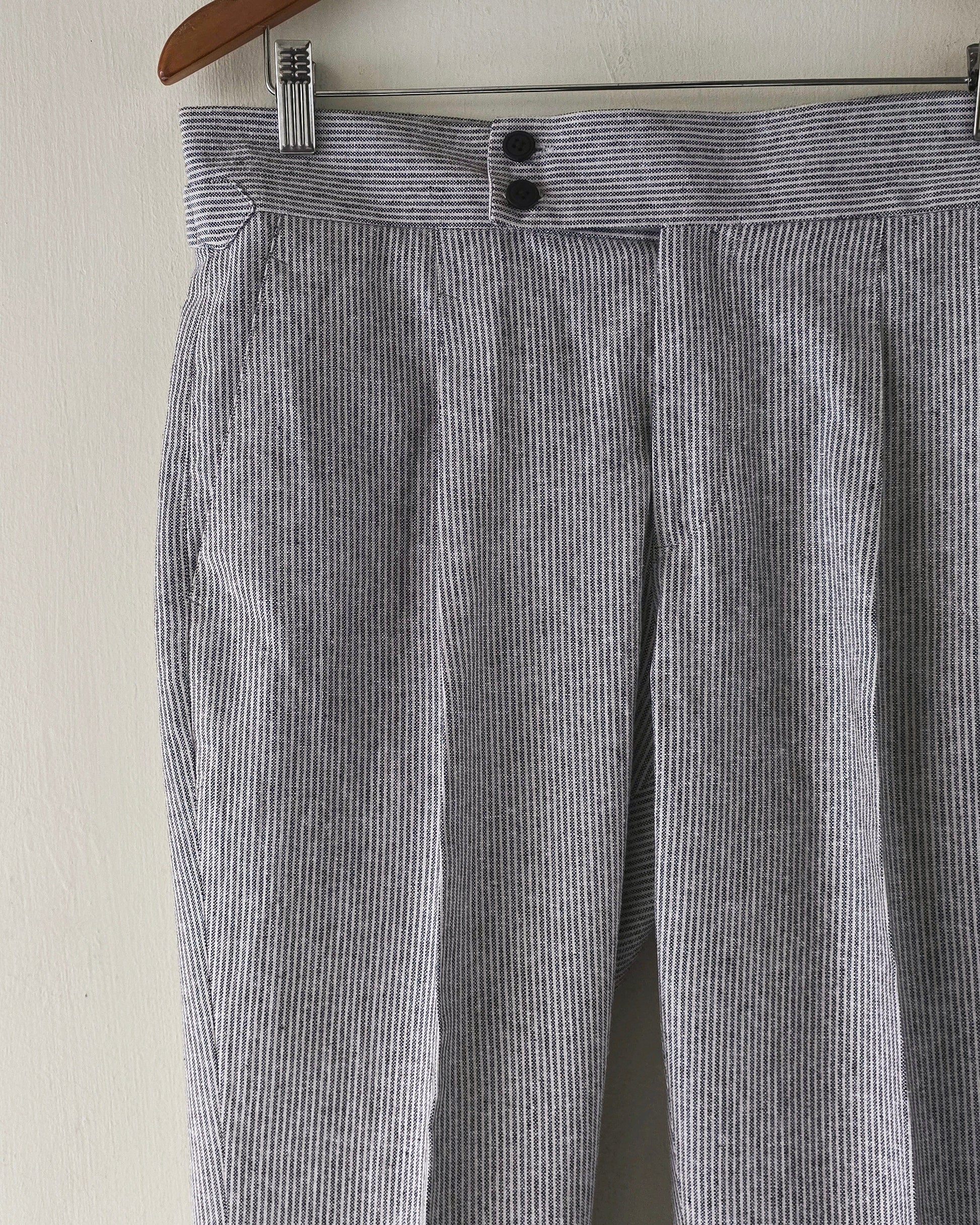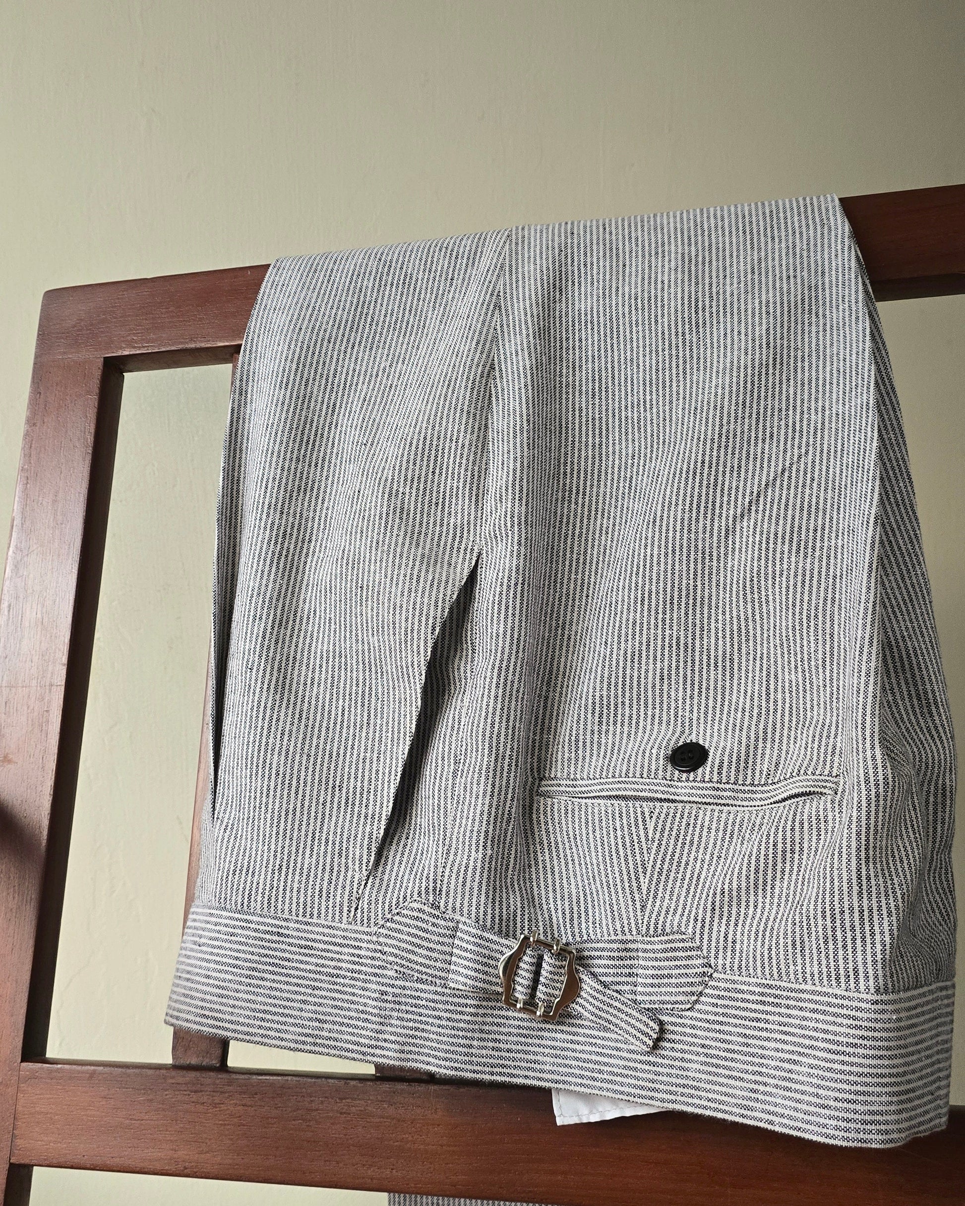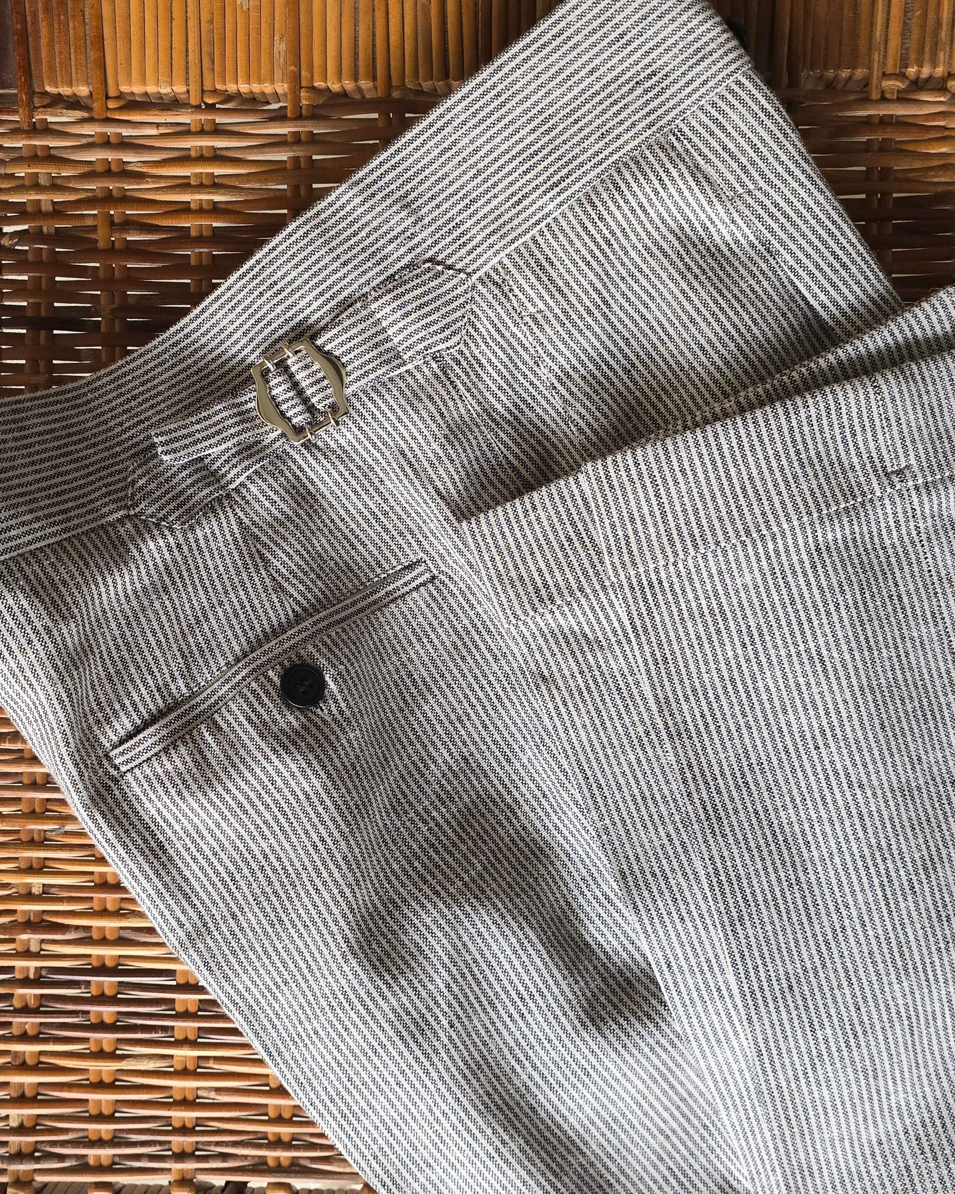 Step up your style with Chamois’ Pin Striped Linen Gurkha Pants. These versatile pants combine a classic pinstripe design with the comfort of breathable linen, perfect for a sharp yet relaxed look. With a unique Gurkha-inspired fit, they bring elegance and distinction to any outfit. Ideal for those who value comfort and timeless style.