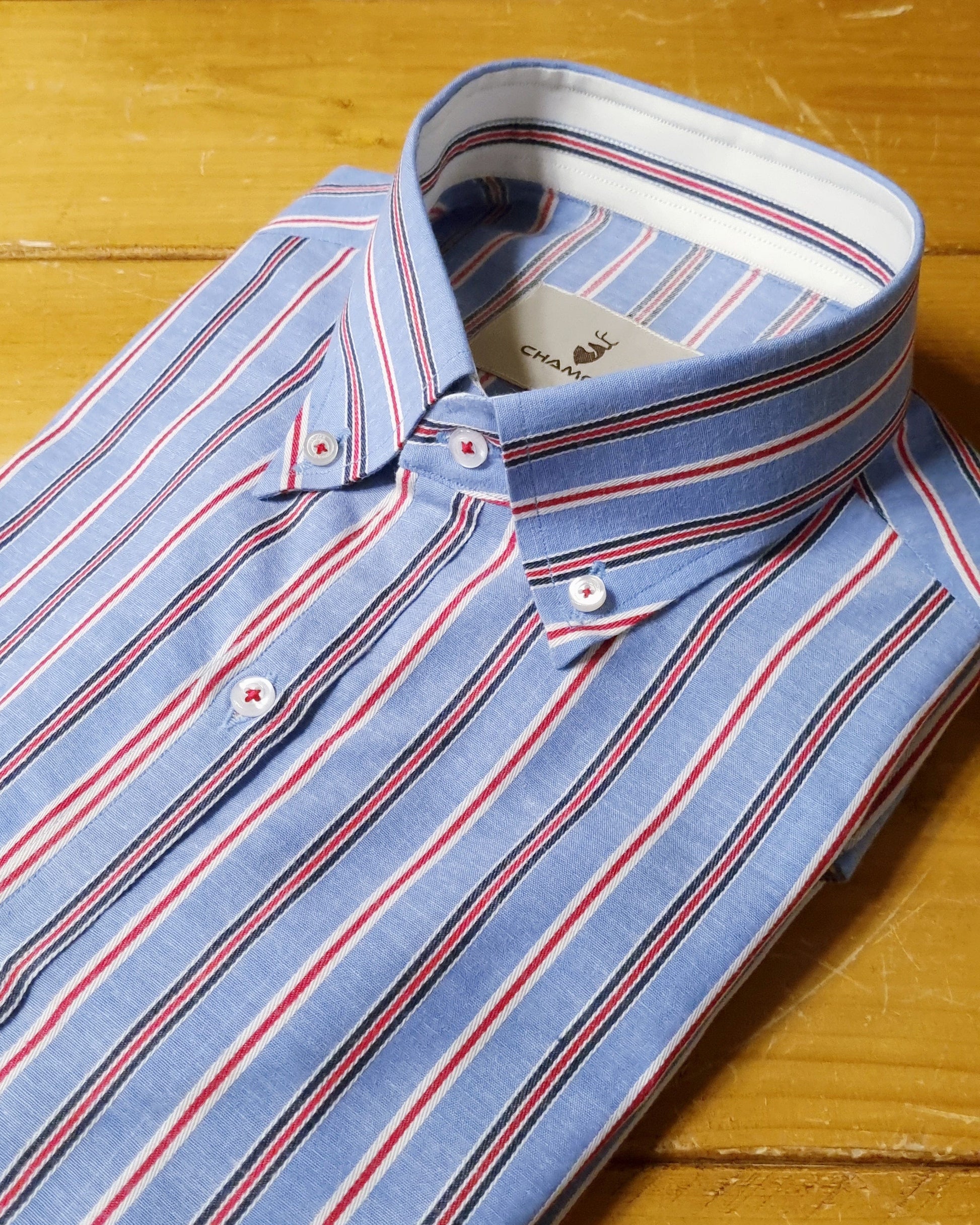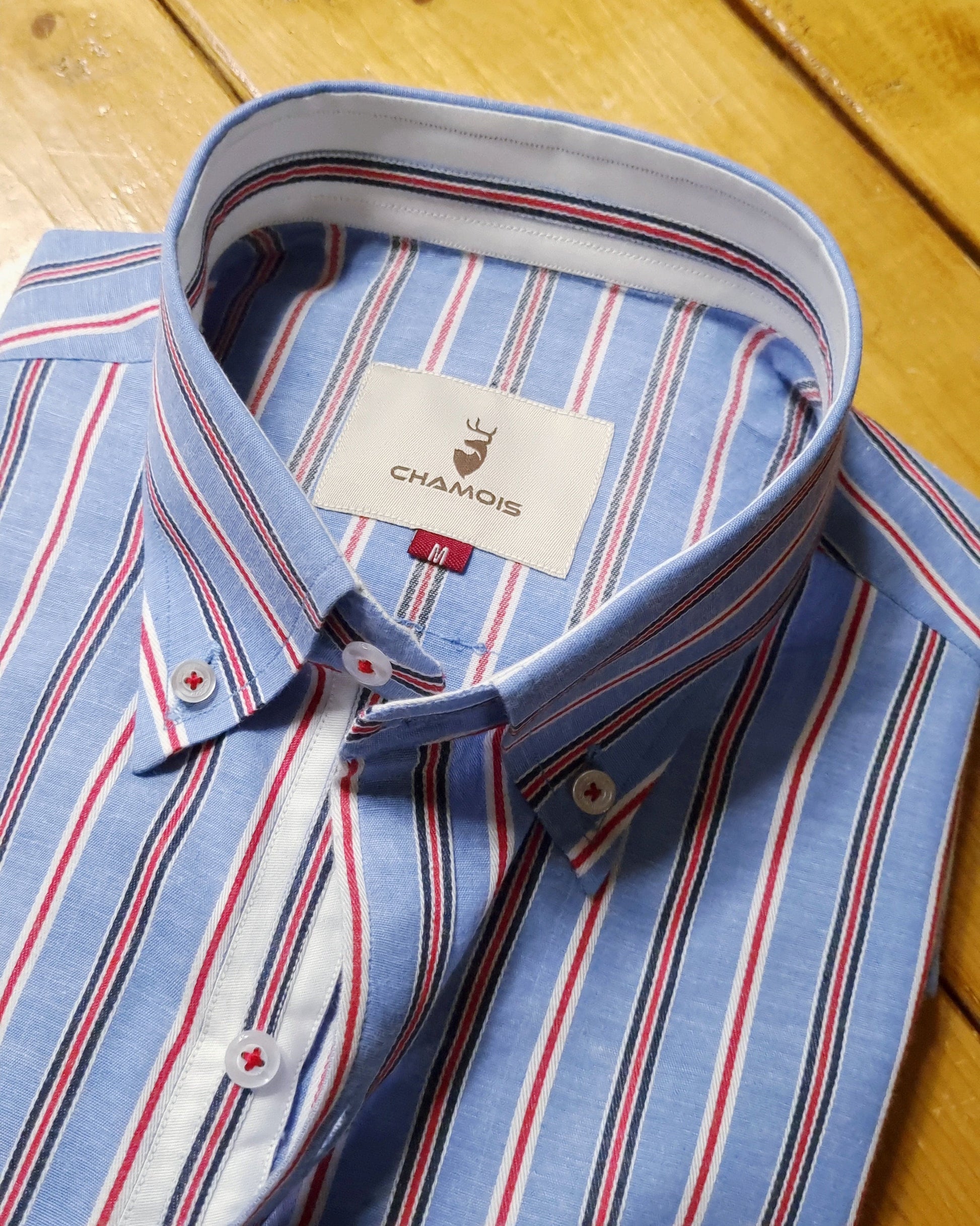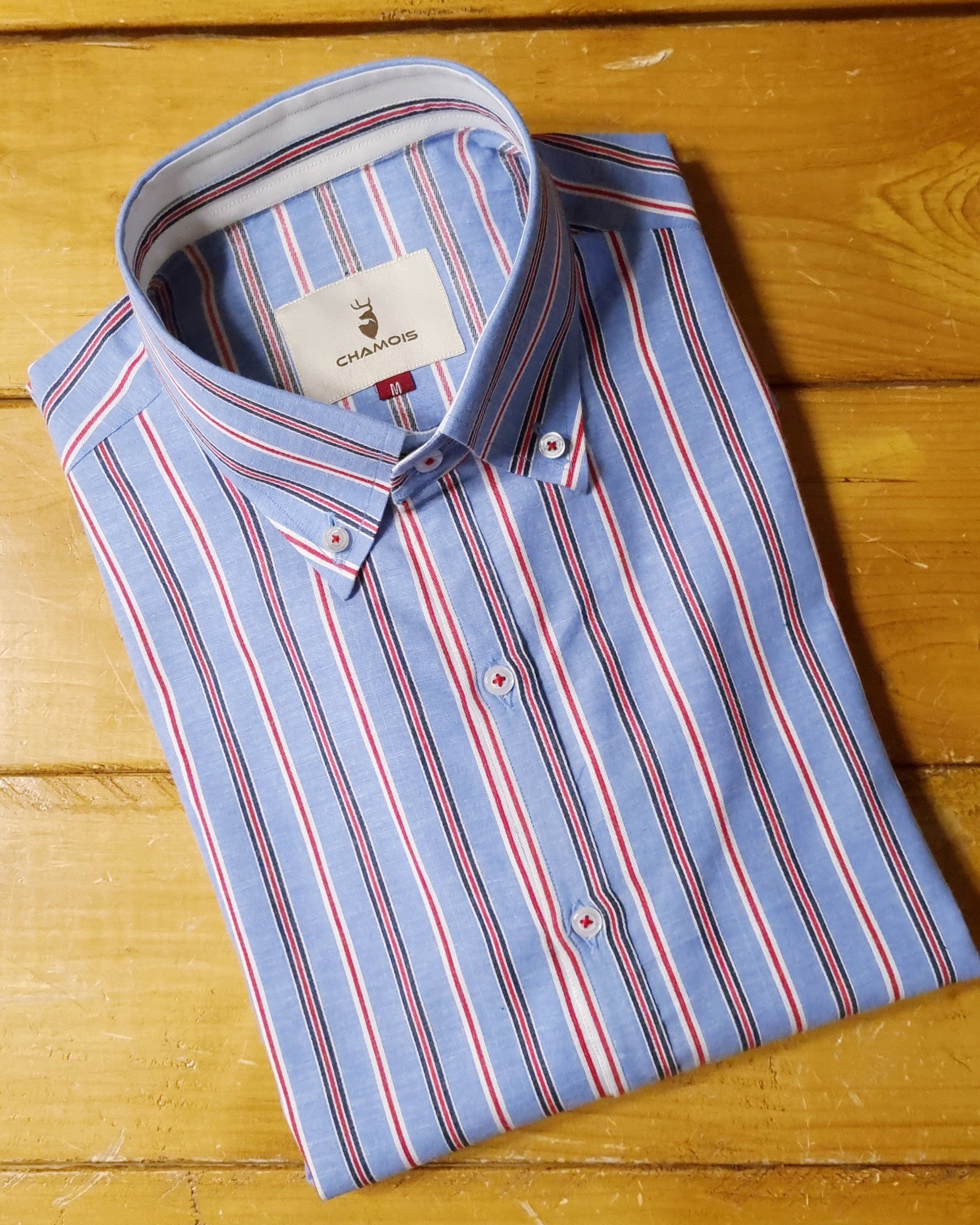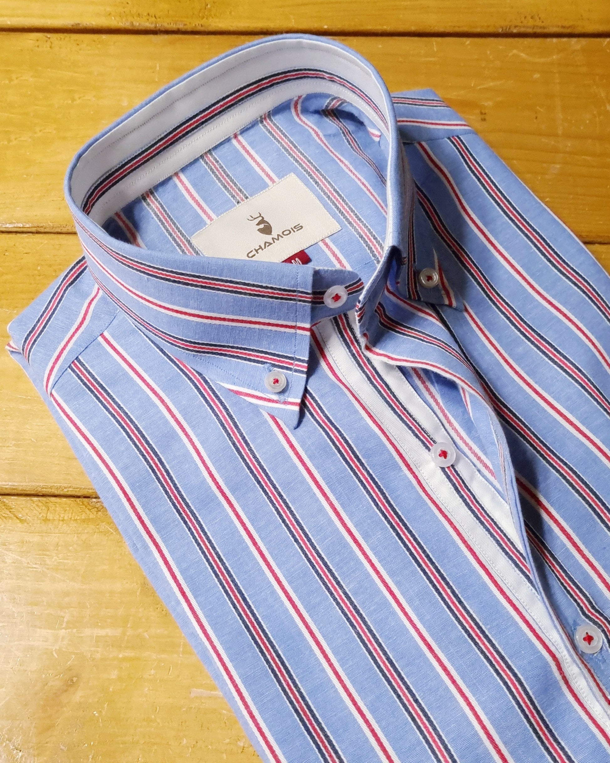 The White-Blue-Red stripe shirt by Chamois is a stylish and versatile piece ideal for casual wear. It features a classic design with evenly spaced stripes in white, blue, and red, offering a vibrant and preppy look. Made from high-quality, breathable fabric, this shirt ensures comfort and durability. It typically comes in a relaxed fit, making it perfect for layering or wearing alone. Suitable for a variety of occasions, this shirt can be paired with jeans or chinos for a polished yet relaxed ensemble.